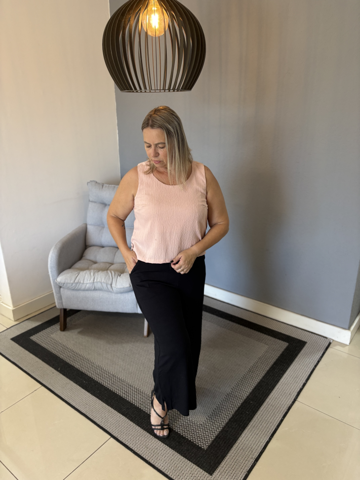 O destaque fica por conta do detalhe em camisa na parte inferior, que cria um efeito de sobreposição moderno e extremamente elegante. A barra com listras traz um contraste sutil e refinado, elevando a produção de forma instantânea.